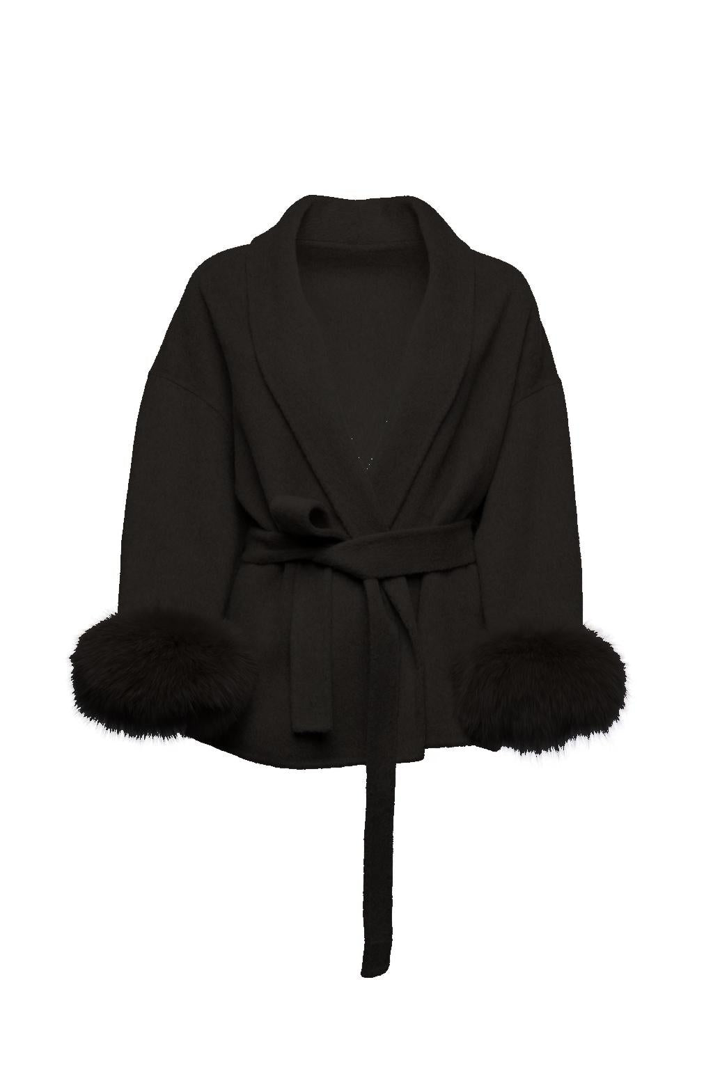 The Nomí is made from 100% wool and features removable fox fur cuffs, offering versatile styling options. The jacket has a belt closure and hidden pockets for a clean, streamlined look. Available in four stylish colours: white, black, taupe, and grey.