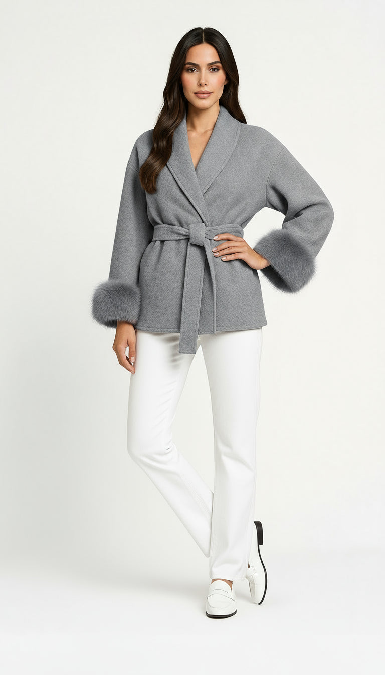 The Nomí Wool Coat combines timeless elegance with modern versatility. Crafted entirely from 100% premium wool, it offers natural warmth, structure, and a refined silhouette. Featuring removable real fox fur cuffs, the design allows you to switch seamlessly between classic and statement looks. A belted waist enhances the figure, while hidden side pockets maintain a clean, streamlined appearance.